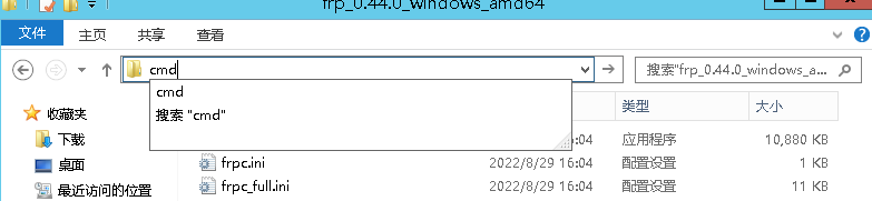 将frps.ini 及frps.exe 上传到公网机器上,以管理员的身份cmd到其目录下,运行如下的命令